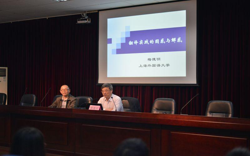 5月15日下午,麓山大讲堂第七讲“翻译实践的困惑与解惑”在二办公楼301开讲,上海外国语大学博导梅德明教授莅临我校讲学,外国语学院院长白臻贤主持讲座。