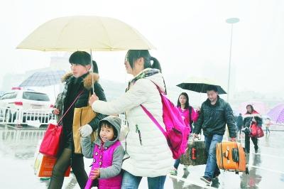 3月15日上午,长沙火车站广场,湖南商学院广告专业1401班的大学生志愿者帮旅客打伞。每年3月是该校的大学生学雷锋活动月,在校生积极响应,利用周末课余时间,到福利院、社区及市内公共场所参加志愿者行动。 湖南日报记者 田超 摄