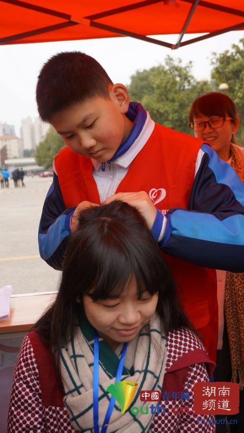 中国青年网长沙3月5日电(记者 周亿颂 通讯员 章沁)3月4日中午,在湖南商学院开展的“公益人生,出彩青春”学雷锋主题月活动启动仪式的现场,一幕温馨的“编发”场景让不少同学停下脚步。今年12岁的周奕孜虽然智力发育比别人晚,凭借一双巧手,他不仅能做出漂亮的工艺品,还能编制出难度系数不小的麻花辫。借着大学生姐姐的满头秀发,周奕孜秀了一把手艺。