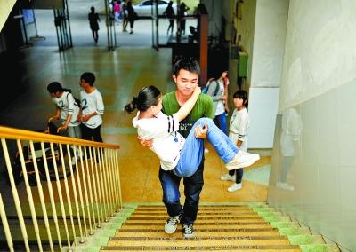 10月27日,湖南商学院,男生抱着陈望爬楼梯进教室上课。今年刚入学的该院电子商务系新生陈望下肢瘫痪,不能独立行走,每次上课上楼都由同学护送,班上的12名男生或背或抱,轮着帮她上下楼。本报记者 童迪 摄