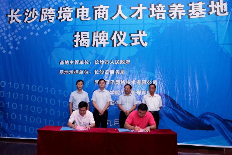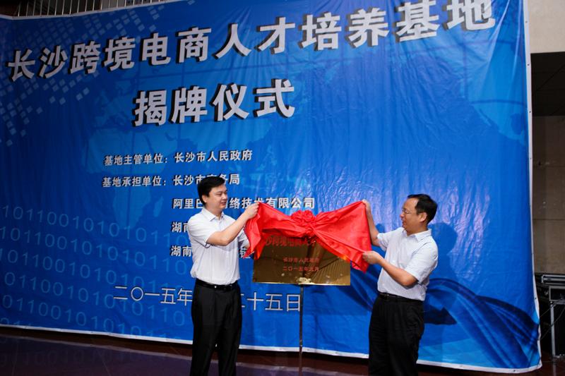 9月25日上午,“长沙跨境电商人才培养基地”揭牌仪式在我校实验楼举行。我校校领导彭进清、刘国权、聂国卿,长沙市人民政府副市长廖健、长沙市人民政府副秘书长王体泽,阿里巴巴湖南区域公司总经理罗海文出席活动。市直相关部门及多个国家级市县园区、我校工商管理学院、人才培养基地各合作院校等负责人和30余家跨境电商企业代表参加了挂牌仪式。廖健副市长和彭进清副校长共同为“长沙跨境电商人才培养基地”揭牌。仪式由长沙市人民政府副秘书长王体泽主持。
