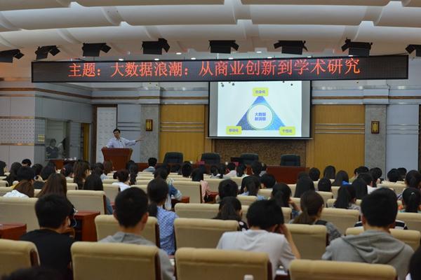 讲座中,贾教授首先指出当今商业创新的三个方向:大数据、社会化、移动化。他表示,公共服务业对城市管理进行数据化统计分析,便于城市优化管理;传统的水产行业也开始了交易数据的收集和分析,这给行业带来了更大的利润。接下来,贾教授从网络反腐出发,论证了社会网络的强大传播力和影响力,并强调了人与人之间社会联系的重要性和社会规范对人们的影响。贾教授还提出了智慧营销的思想,旨在用大数据、社会化、移动化的视野做精致的营销方案。他告诫在场学生:“不要盲目为了数据而数据,更重要的是用数据解决管理之中存在的问题。”
