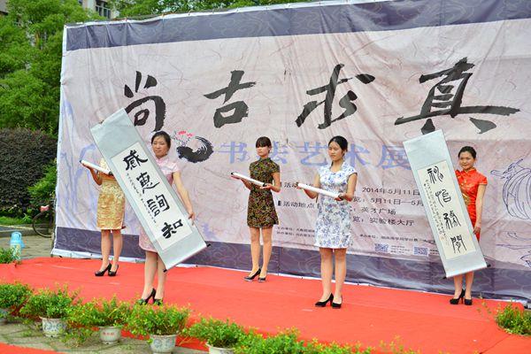 5月11日下午,由校团委主办,大学生书法协会承办的“尚古求真”书法艺术展在英才广场举行了开幕式。原副校级督导唐德斌、设计艺术学院党总支副书记李碧高、书协指导老师冯勇等参加开幕式。